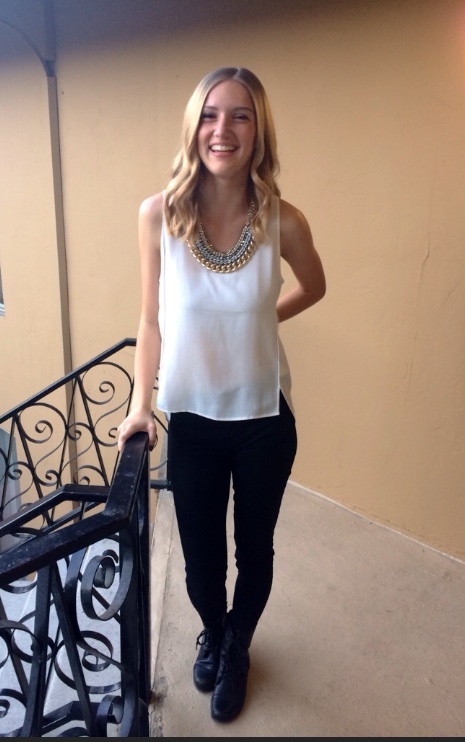 Here, I’m heading out to dinner with friends, full of laughter. I chose to wear this piece with a high collared sheer white tank and black skinny cropped pants. My closet is filled with black and white. This look would be a classic paired with some fun flats. But for me, I like adding a bit of an edge with my black leather Steve Madden Troopa lace-up boots.